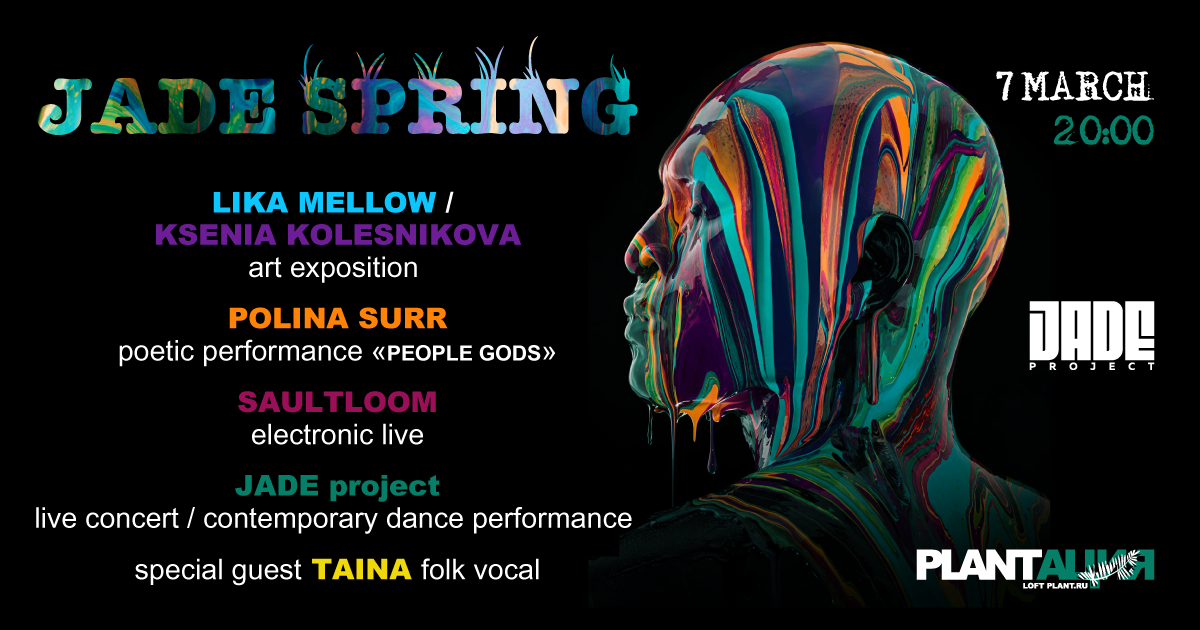 Хедлайнер вечера JADE project - встретит тебя неповторимым перфомансом. Авторская музыка, симбиоз живых и электронных инструментов, в самых современных тенденциях звучания в сочетании с этно вокалом Tati (Татьяна Ухина) откроет в тебе внутренние силы и невероятную энергию. Артисты балета Москва Анастасия Пешкова и Андрей Остапенко претворят эту энергию в движения, раскроют красоту и пластику человеческого тела.