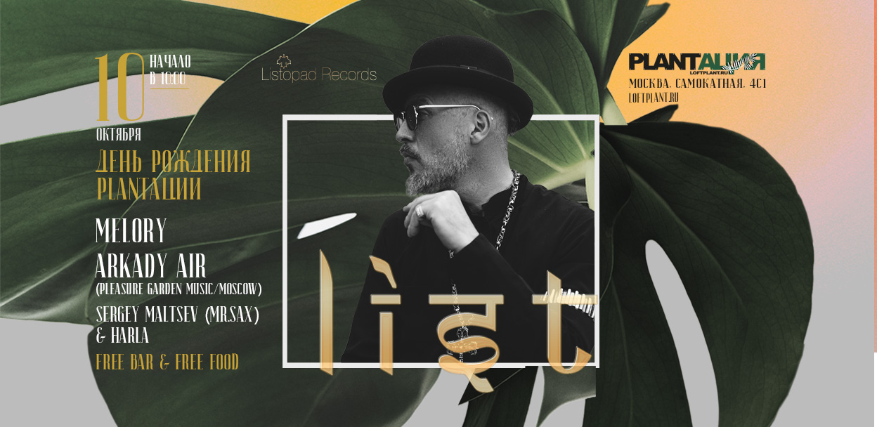 Ну и на горячее, с 14:00 парадом править начнет прирожденный хедлайнер любого мероприятия, настоящая легенда, LIST собственной персоной. Где, как не на Плантации среди растений ему будет максимально комфортно? Король эпатажа и перевоплощений. Интересно, в каком образе он предстанет перед нами на этот раз?